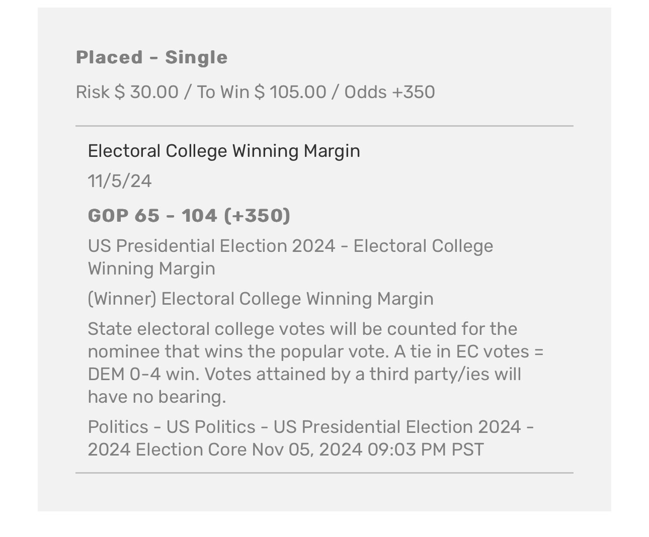 But thatâs not what yoouâre actually doing. You settled a republicans to win Nevada well before it was officially called. YetâŚI have a republicans to win between 300-328 electoral college votes and itâs unsettled. Itâs 100% a winner no matter what happens in Arizona. So settle a wager that is a winner and cannot lose.