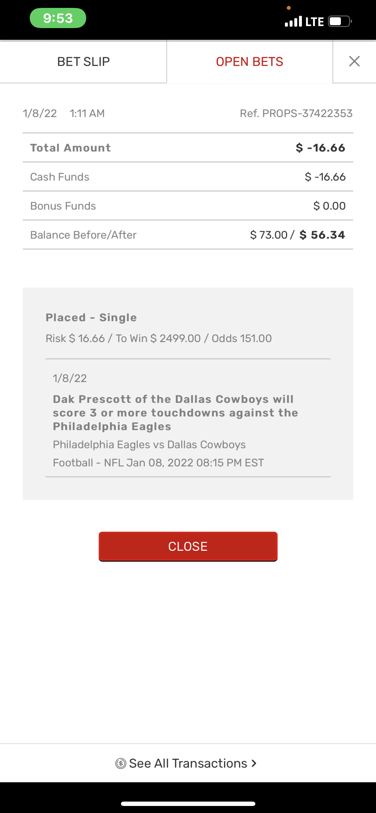 Last Night 1/08/2022 I bet 16.66 on Dak Prescott to score at least 3 touchdowns or more vs the Philadelphia Eagles. He went 21/27 297 and 5 TOUCHDOWNS. I WON MY BET!!! Why am i not receiving my winnings???