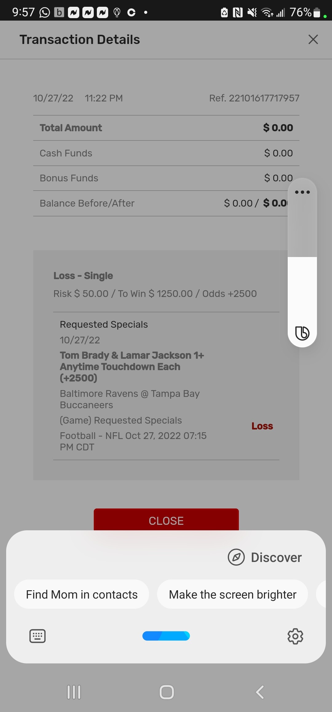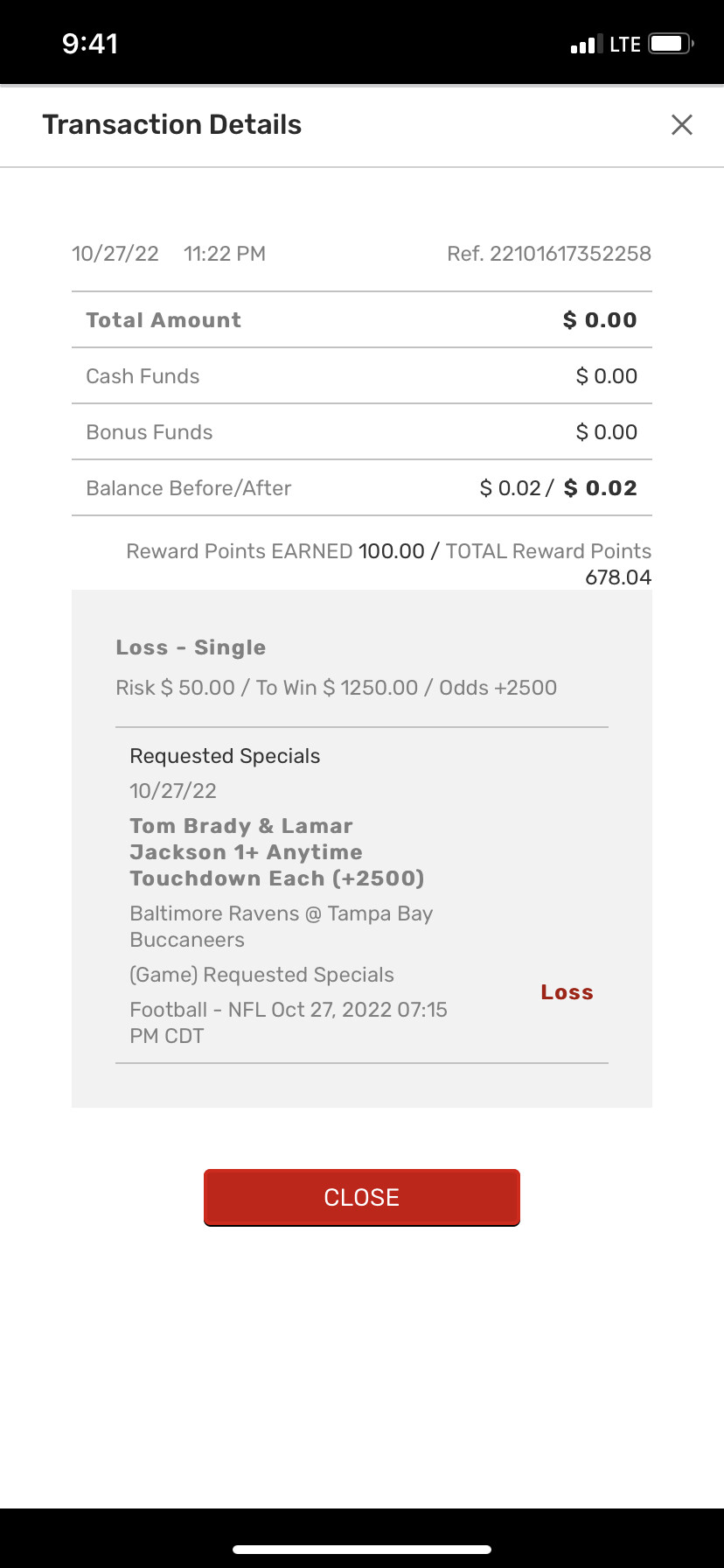 I put in for the Lamar Jackson and Tom Brady 1+ touchdown and it says I lost but I didn’t ref. Number is 22101617527200