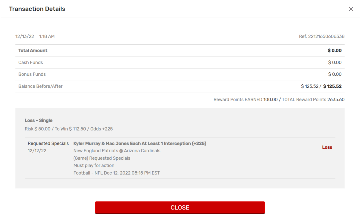 Last night I made a bet of 50 dollars on Mac Jones and Kylar Murray to both throw an interception in the MNF game. As many of you know, Kylar Murray tore his ACL on like the third snap of the game. It was a very sad thing to see. On every other sportsbook I can think of this bet would be voided because the player didnât even play a quarter of the snaps of the game.
