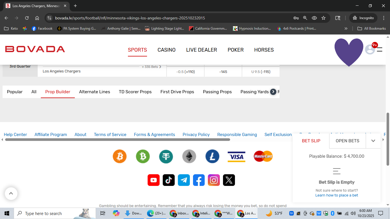 Also another issue that I noticed not sure about other players, prop builder stops working 3 hrs prior to Sunday early NFL games since last 2 weeks. Tried it on other site (not sister site) same issue. It could be an issue with vendor that bovada is using for prop builder. It starts to work prior to noon games.