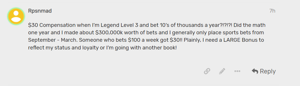 I go back to the Bodog days when you had to wire money to fund the account. Legend Level 3 and only received $30. I guess it is what it is. I have other options so I guess I will need to utilize those from now on.